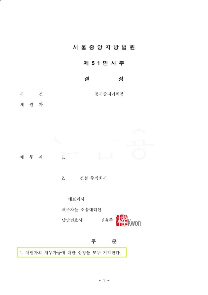 [공사중지가처분] 공사중지가처분 채무자측 방어 승소