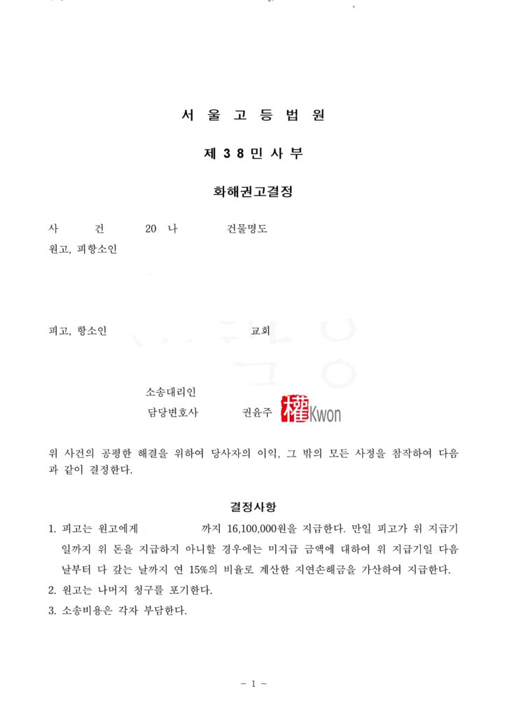 의뢰인은 건물을 점유하고 있는 교회로서 해당 건물을 경매로 낙찰받은 소유자로부터 명도소송을 당하였습니다.