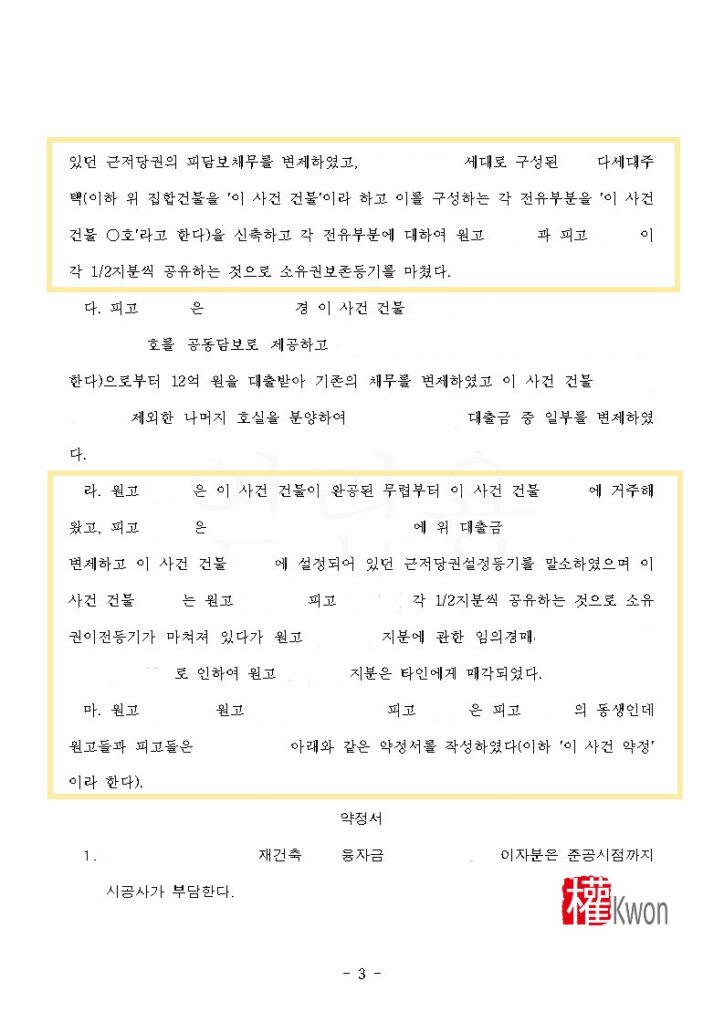 결과는, 양측이 특정호실(대물변제하기로 한)을 제외한 나머지 호실을 기준으로 5:5로 정산하라는 내용이었습니다. 특정호실에 대해서는 이미 2분의 1씩 지분등기가 되어 있으므로 정산이 완료된 것으로 보았습니다.다만, 정산에 관한 소송에서는 위 약정 내용이 쟁점으로 판단되지 않았습니다.