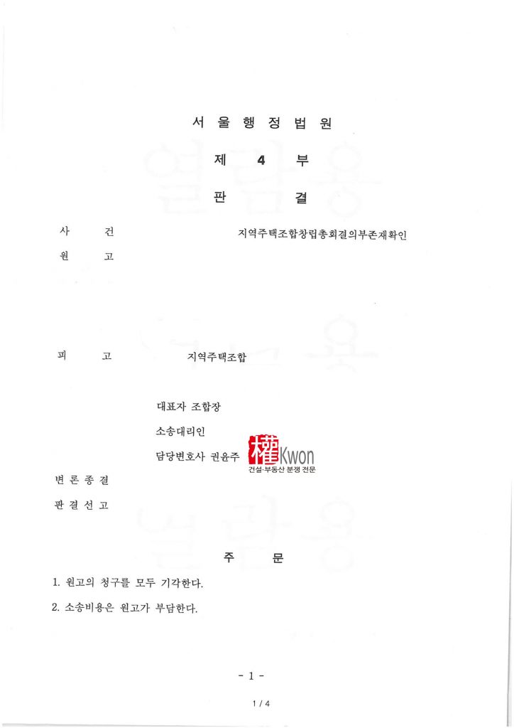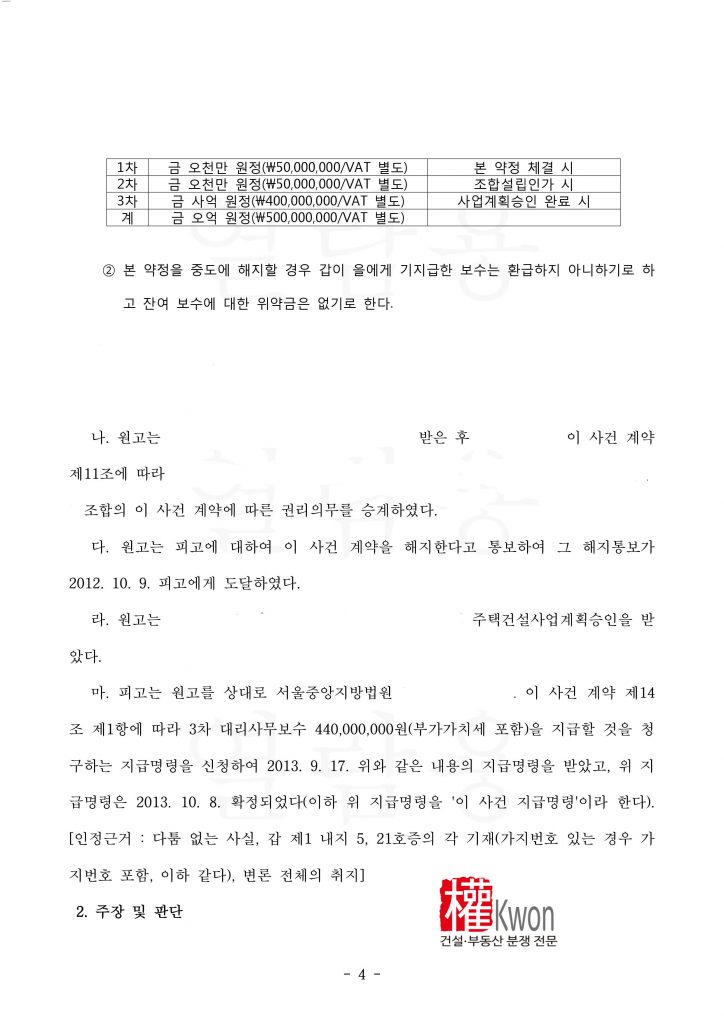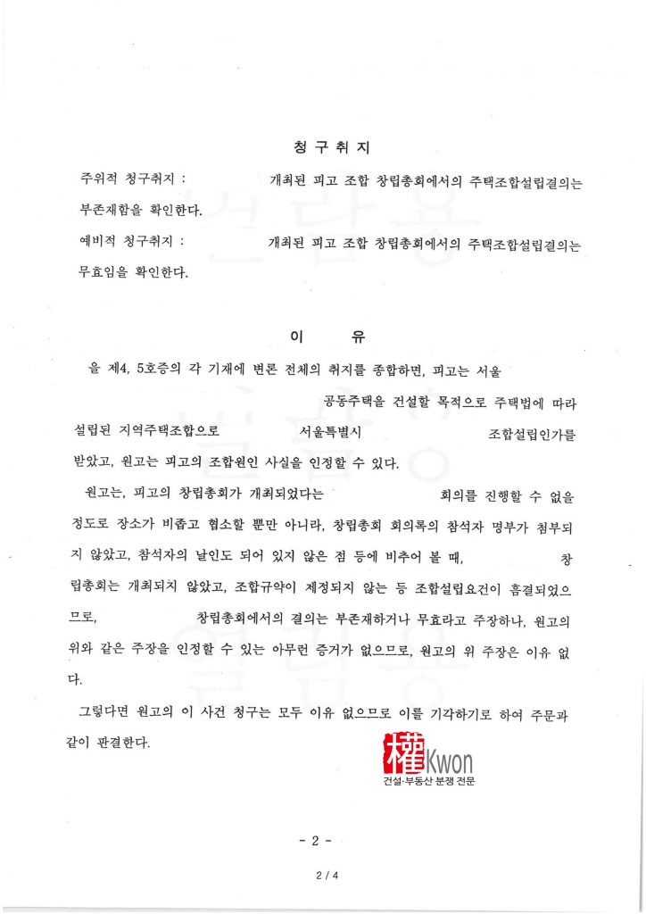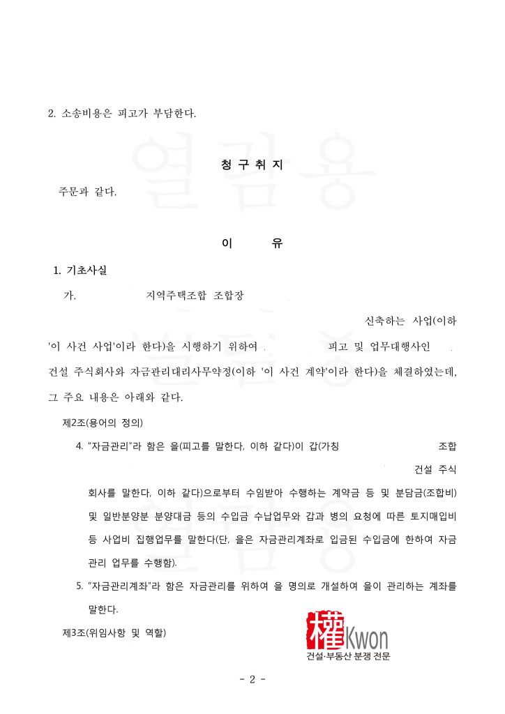 조합의 의사표시와 관련하여 조합규약, 주택법령을 종합할 때 조합원 총회결의가 필요한 사항과 그렇지 않은 사항의 구별기준에 대해 주장, 입증하였습니다.