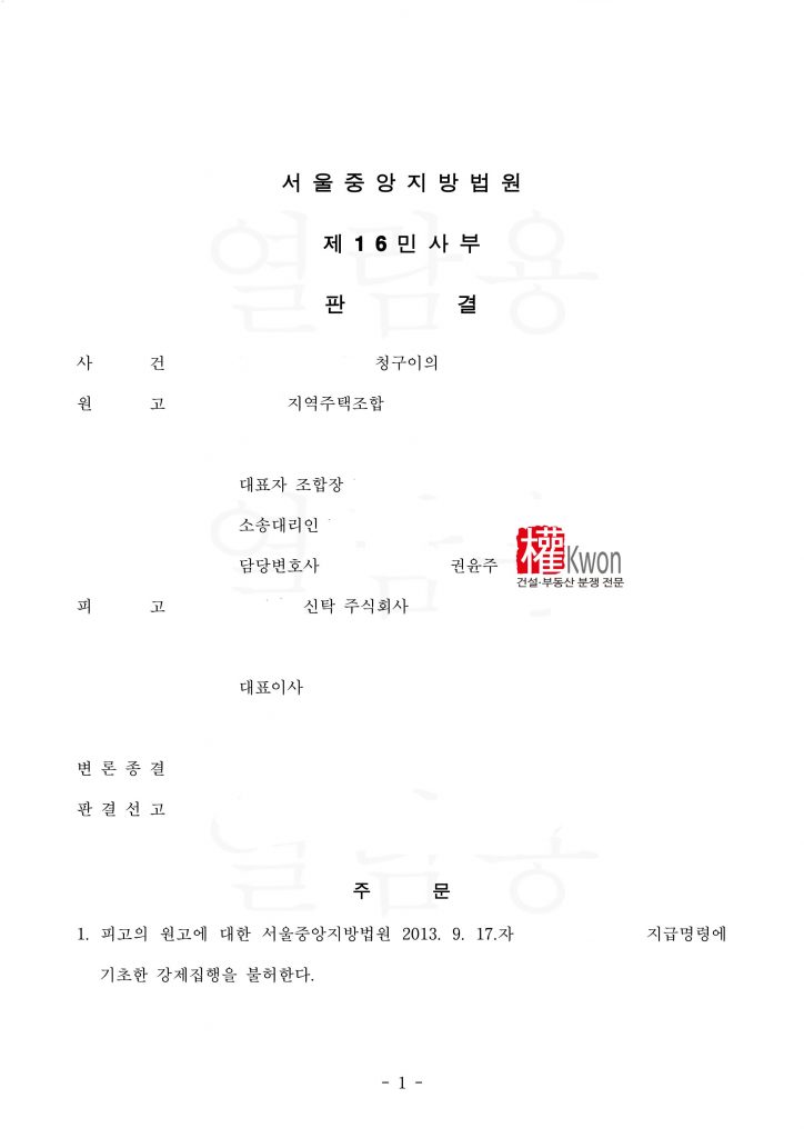 원고는 지역주택조합이고, 피고는 종전 자금관리업무 수탁사인 신탁회사였습니다. 피고는 원고를 상대로 업무대행비에 대한 지급명령을 신청하였는데 원고 내부사정으로 지급명령에 대한 이의를 못하여 확정이 되었습니다. 이에 부랴부랴 원고가 지급명령에 대한 집행정지신청 및 청구이의의 소를 제기하게 되었습니다.