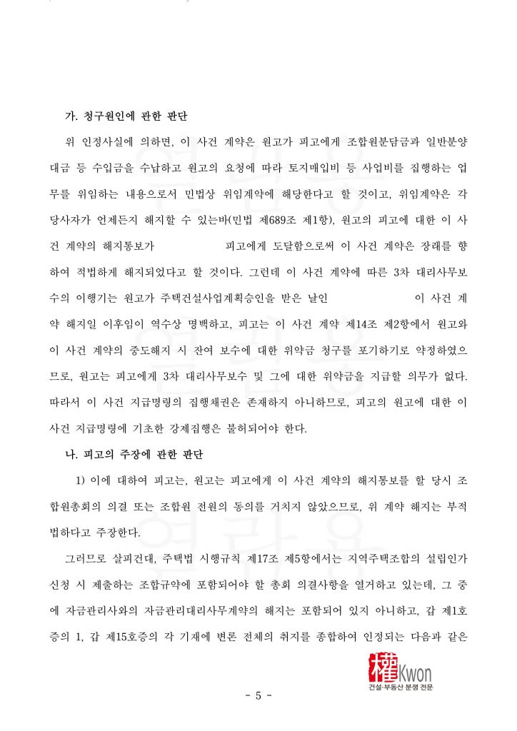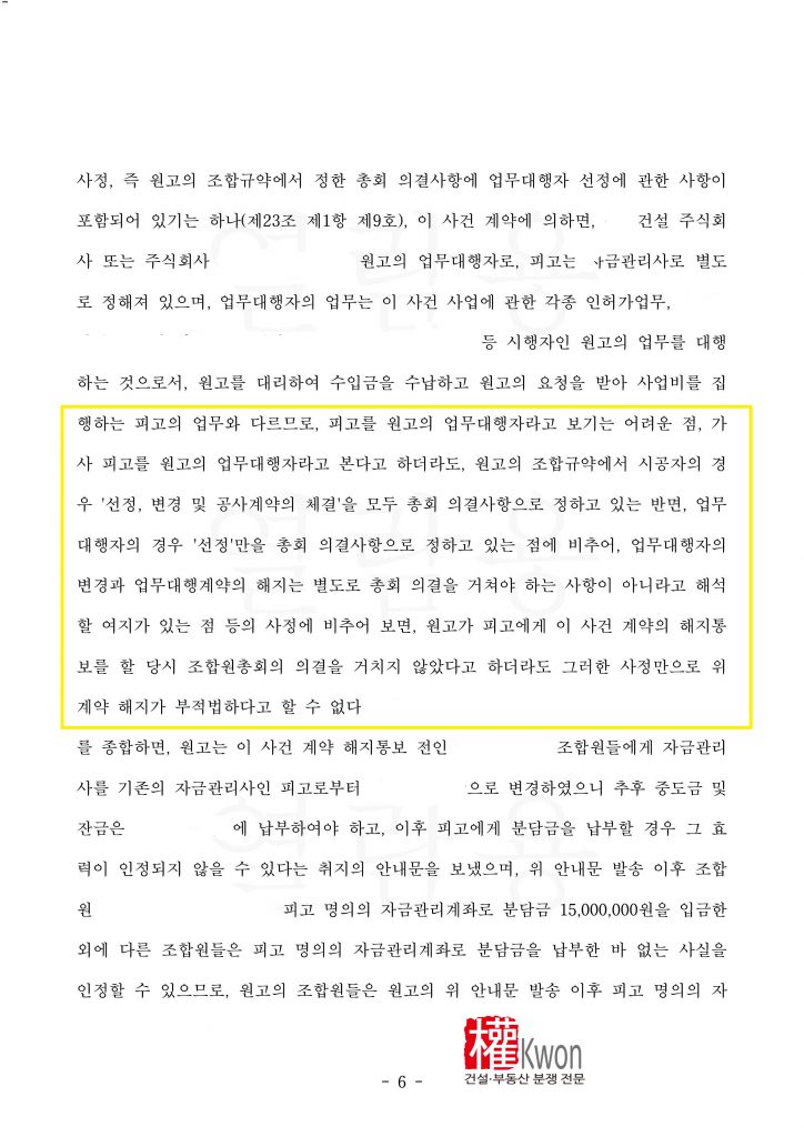 피고는, 원고가 지역주택조합이라는 특수한 단체이므로 피고와의 계약을 해지하기 위해서는 조합원 총회의 의결이 있어야만 하는데, 총회의결 없이 이루어진 해지통보는 부적법하다고 주장하였습니다.
