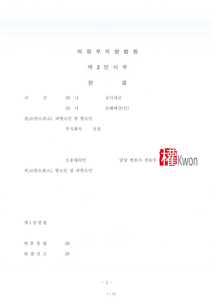 원고는 시공사로서 공사를 완료하였고, 피고는 건축주로서 사용승인 및 신축건물을 인도받았음에도 불구하고 건축물의 하자를 주장하며 일부 공사대금을 고의로 지급하지 않았습니다. 이에 원고는 신축건물에 대해 가압류, 공사대금청구 소송을 제기하였고, 피고는 반소로써 하자보수에 갈음한 손해배상을 청구하였습니다.