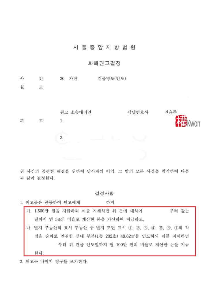 결론적으로 원고는, 피고들의 연체차임을 일부 감액하고, 건물인도 지체시 위약금 월 100만원씩을 받기로 하는 내용으로 화해권고결정을 수용함으로써 전부승소하는 결과를 얻게 되었습니다.