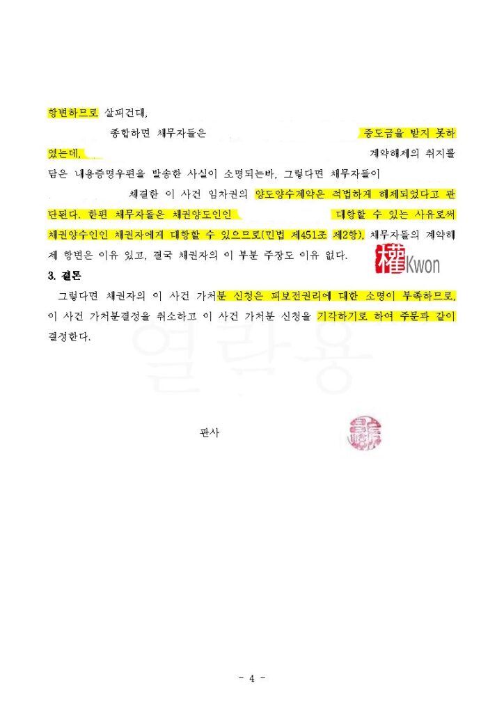 법원에서는 임차권계약의 상대방에 대해 의뢰인이 계약해제권을 적법하게 행사했다고 보아 가처분을 취소하는 결정을 내렸습니다.