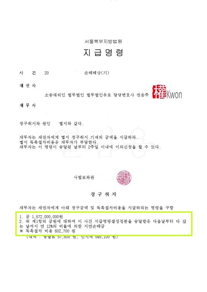 상대방도 다투지 않을 예정인 경우 지급명령을 통해 15억여원의 집행력을 확보하였습니다.