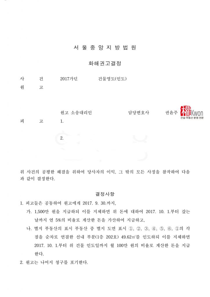 [명도소송] 건물명도소송 전부승소, 화해권고결정